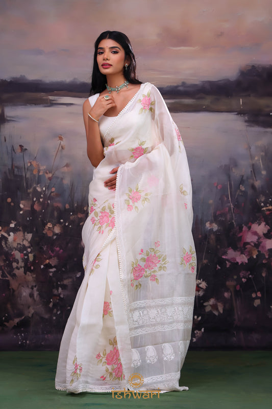 Sky Blue Floral Glass Organza with Chikankari Blouse