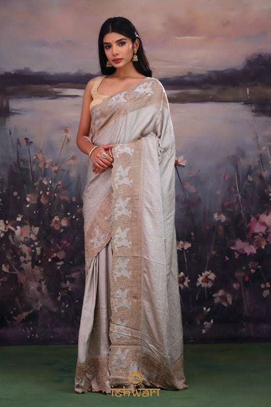 Lavender Tissue Saree with Aqua Embellished Border and Work Blouse – House of Ishwari