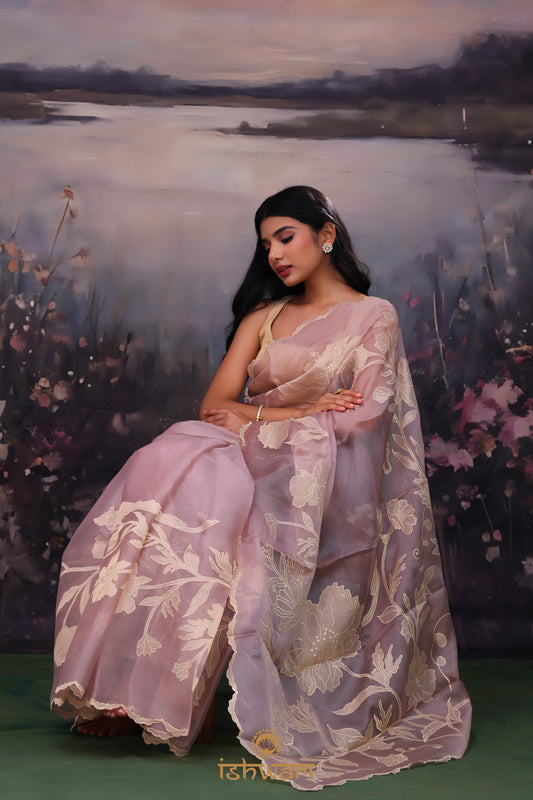 Thistle Purple Applique Organza Saree with Scallop Border