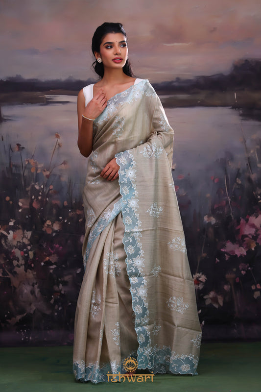 Dark Grey Applique Tussar Saree