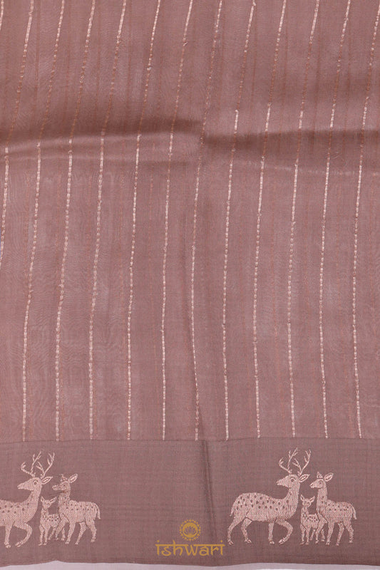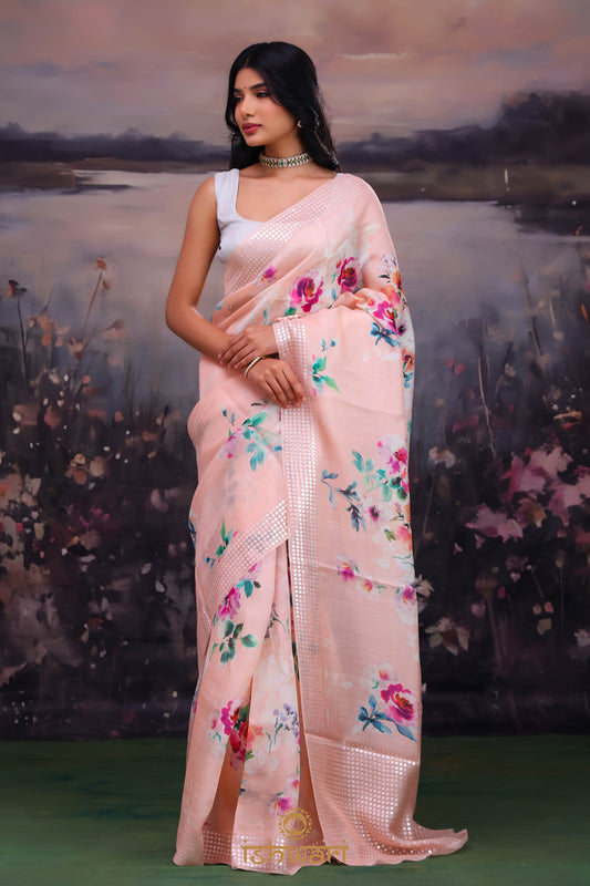 Deep Taupe Digital Print Organza Saree with Banarasi Border