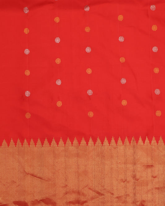 Red Gadwal Silk Saree with Elephant & Peacock Zari Motifs and Contrast Orange Blouse