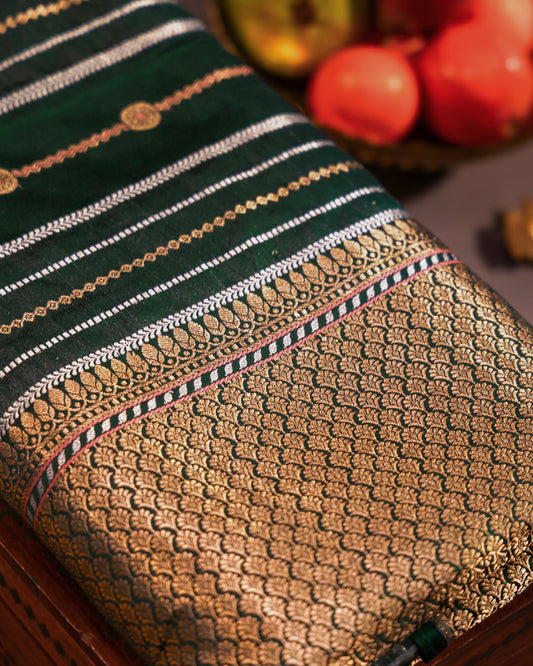 Deep Green Striped Banarasi Katan Satin Saree