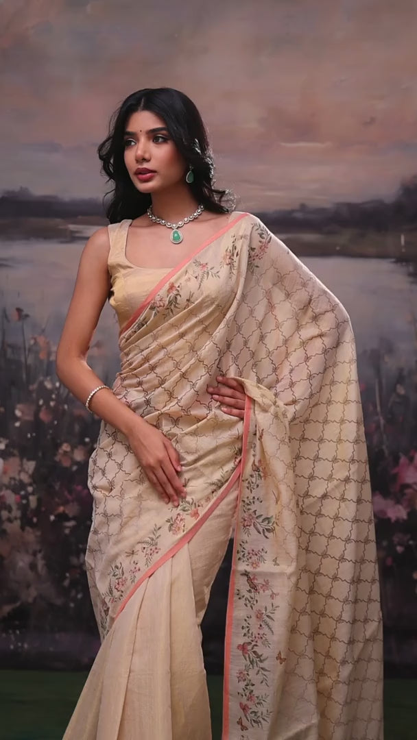 This Almond Brown Mul Cotton Saree showcases digital floral patterns with a traditional border. The soft brown tone creates a gentle, feminine look that stands out subtly. Comes with a matching blouse piece. Ideal for festivals and semi-formal occasions.