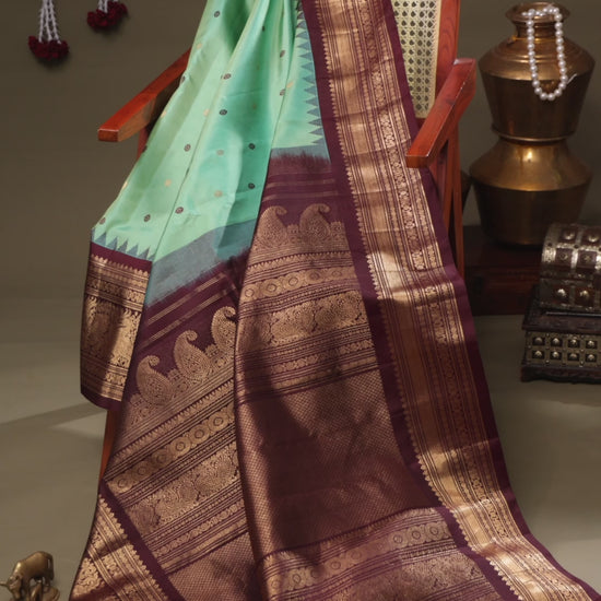 legance meets tradition in this stunning Aqua Green Gadwal Silk Saree. The body is adorned with small gold zari buttas, while the contrast coffee brown border showcases intricate zari weaving with peacock and floral motifs. The rich zari pallu enhances its grandeur, making it a perfect drape for weddings, festive occasions, and traditional celebrations.