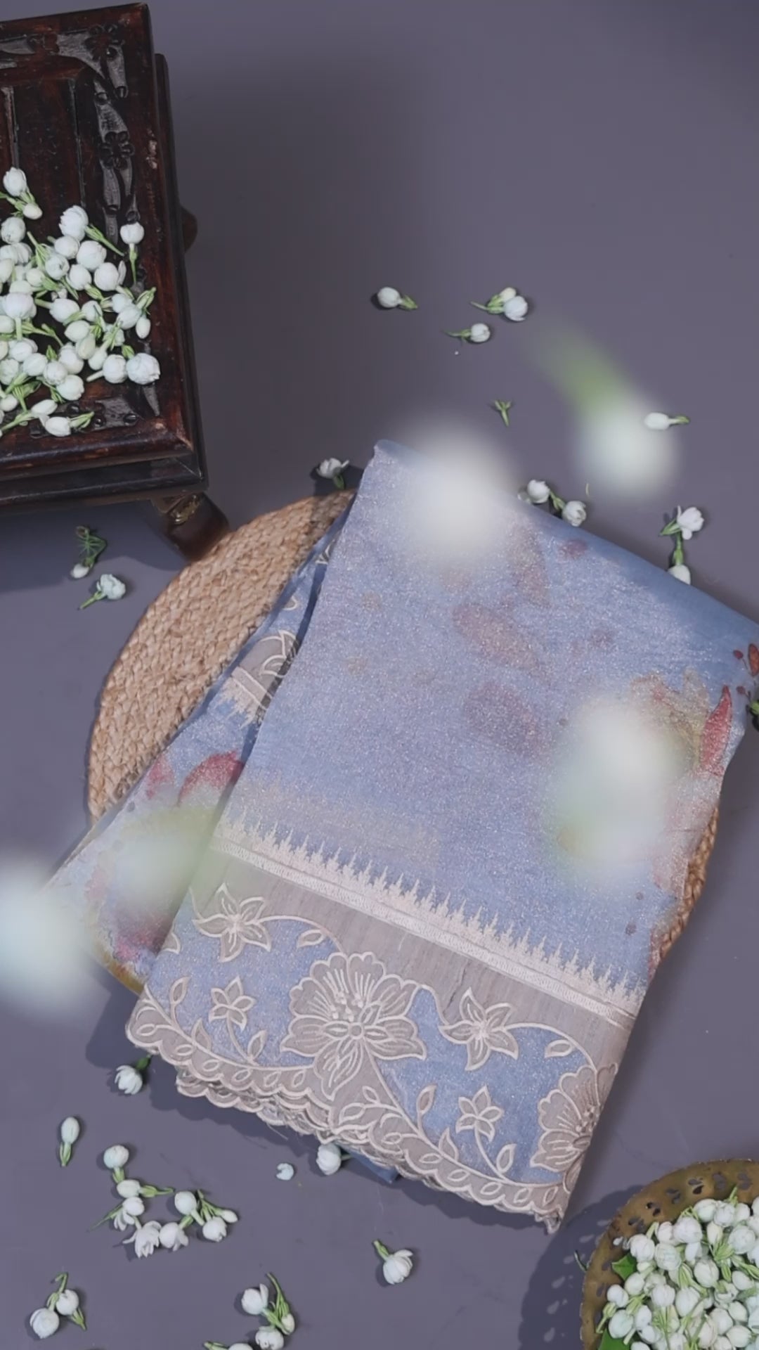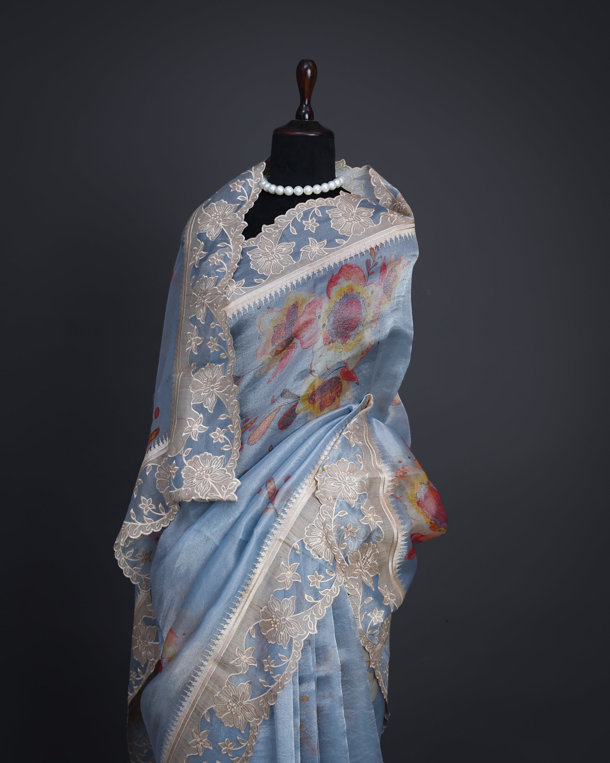 Baby Blue Print Silk Tissue Saree with Tussar Applique Border