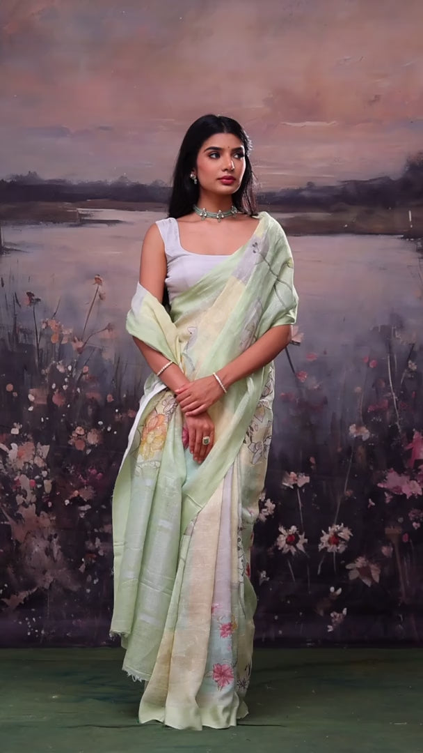 This Blue-Green Shaded Linen Saree offers a sophisticated gradient effect from edge to edge. The subtle colour transition with printed floral patternvcreates visual interest while maintaining elegance. Includes a coordinating blouse piece. Perfect for casual gatherings and office wear.