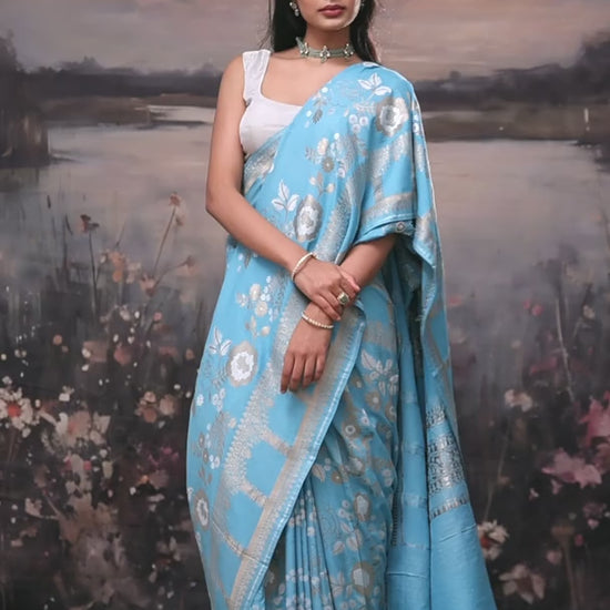 This Bright Blue Kora Katan Moonga Handloom Saree combines flowing fabric with traditional weaving techniques. The three-fabric combined draped with zari craftsmanship creates an elegant, comfortable look. Comes with a matching blouse piece. Ideal for weddings and formal events.