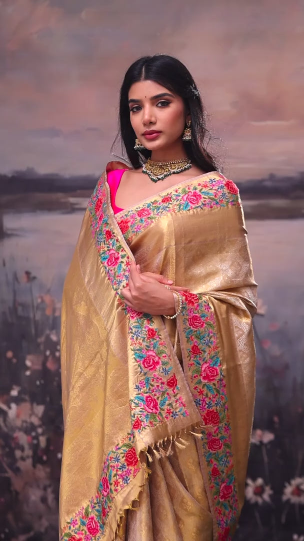 A shimmering Bright Gold Kanchi saree with a delicate petite point work border. The pallu is full of heritage-inspired designs. Comes with a coordinated blouse piece. Just right for big celebrations and family functions.