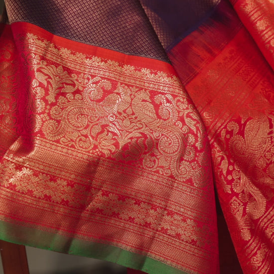 This Gadwal brocade silk saree features a rich brown body with intricate zari motifs, blending traditional craftsmanship with regal charm. The contrast orange border and pallu are adorned with exquisite peacock and floral zari designs, highlighted by a striking green selvedge for added elegance. Perfect for weddings, festive occasions, and grand celebrations.