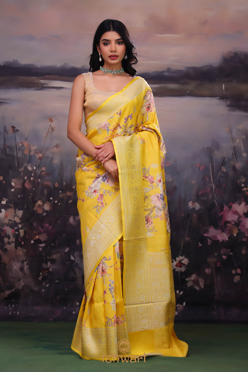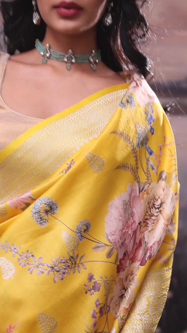 Canary Yellow Floral Print Silk Saree with Banarasi Border
