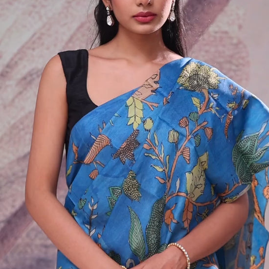 This Capri Blue Kalamkari Silk Saree displays traditional artistry on a modern transparent base. The hand-painted details create floating art with every movement. Includes a coordinating blouse piece. Ideal for cultural events and special occasions.