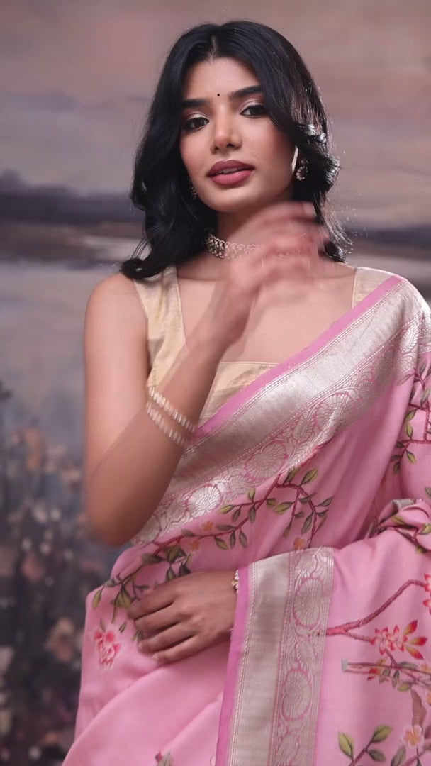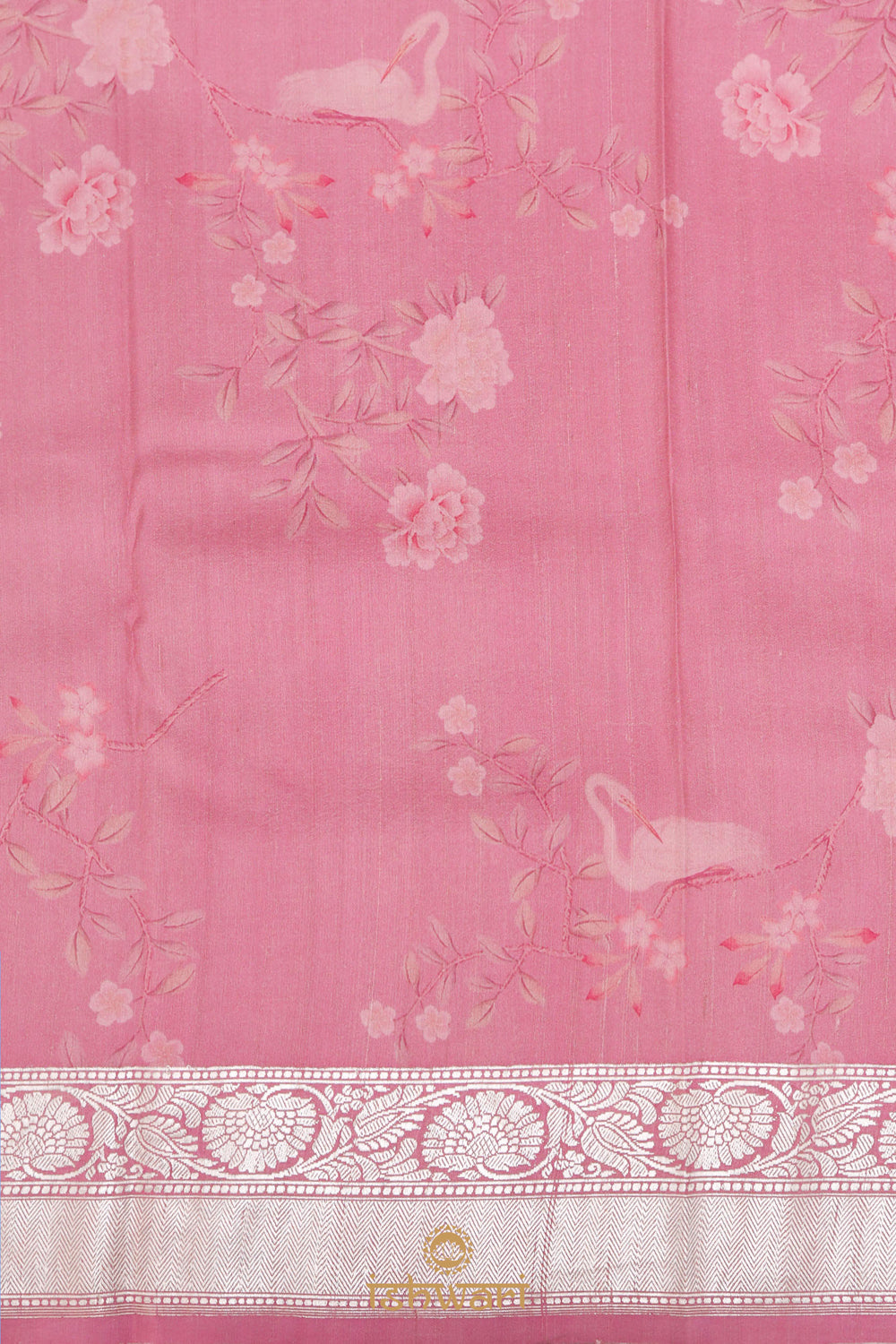 Carnation Pink Floral Print Banarasi Tussar Saree