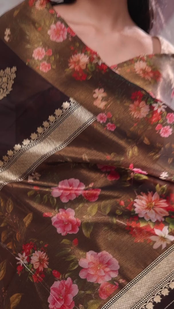 Coffee Brown Printed Kora Tissue Saree with Contrast Border