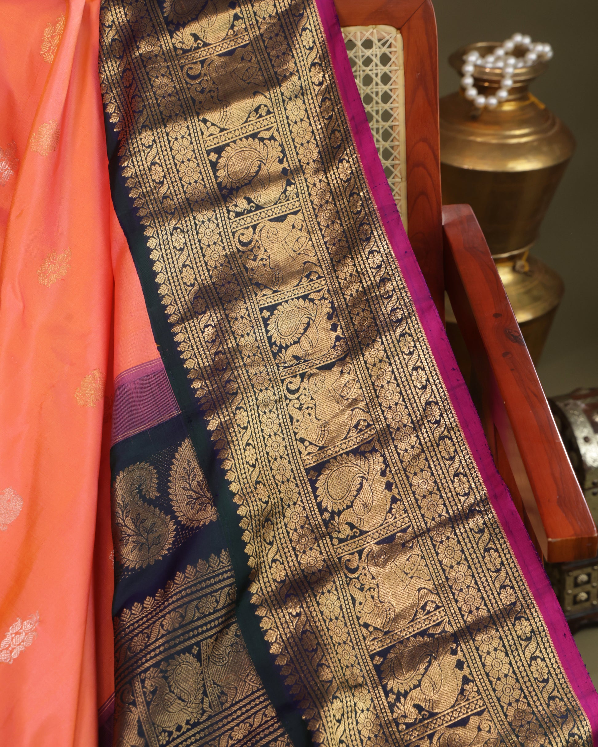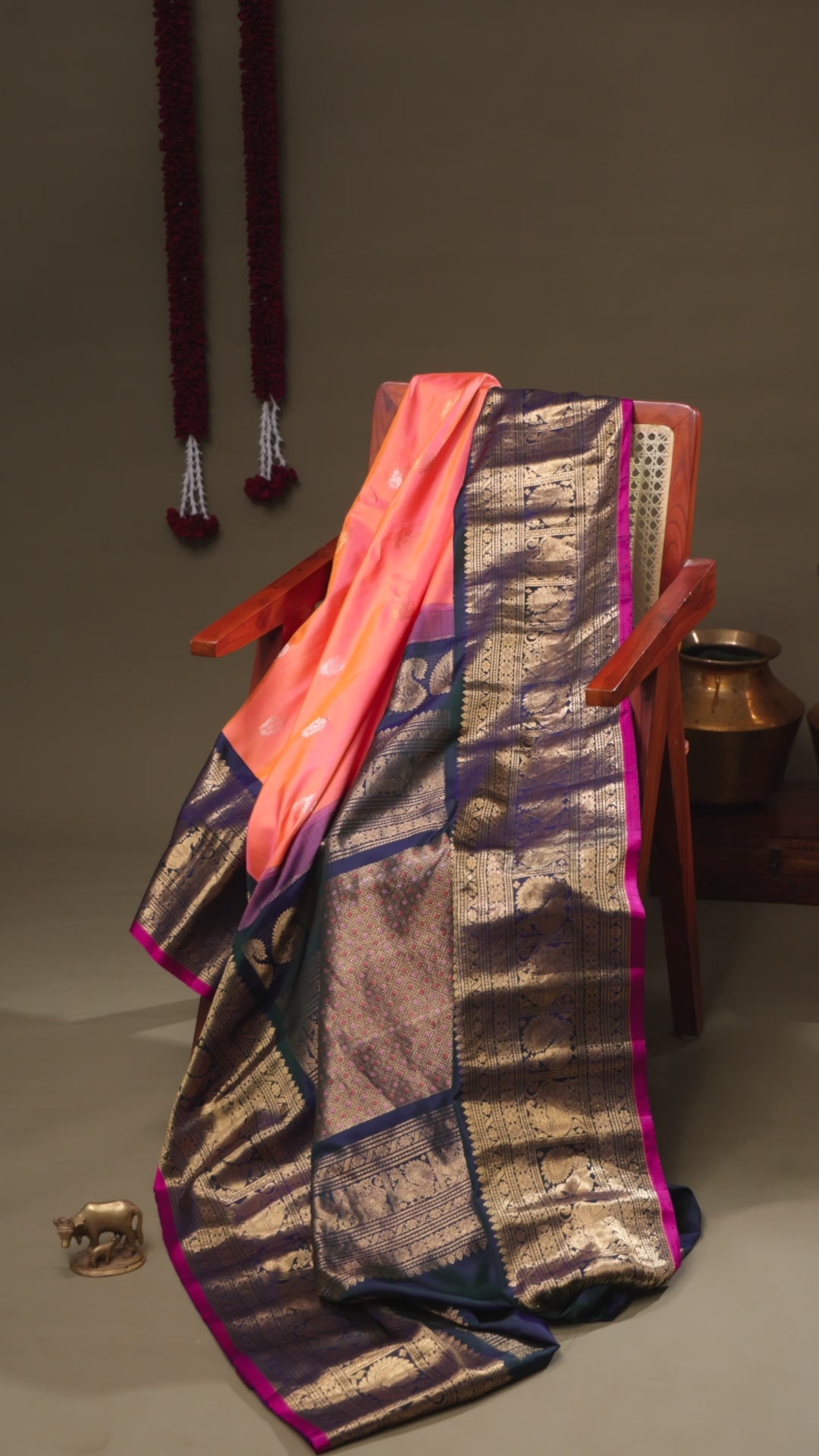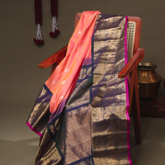 This vibrant Gadwal silk saree features a coral body with shimmering zari buttas. The striking navy blue border is woven with traditional peacock and temple-inspired motifs in gold zari, finished with a pink selvedge. The grand zari pallu adds a regal touch, making this drape perfect for weddings, festive occasions, and traditional events.