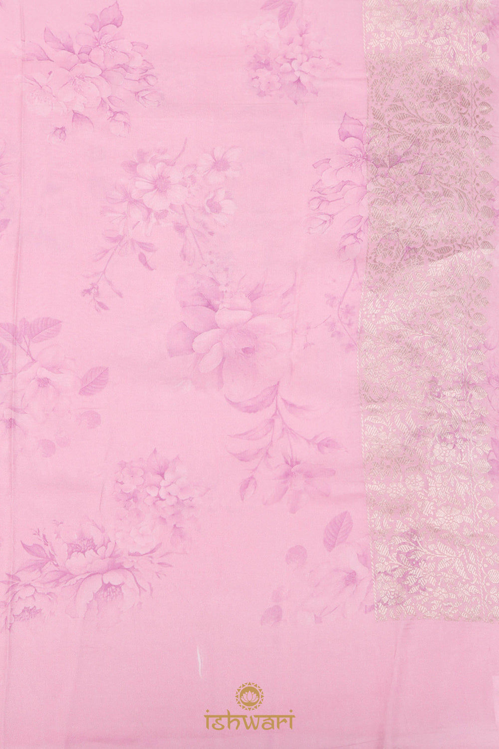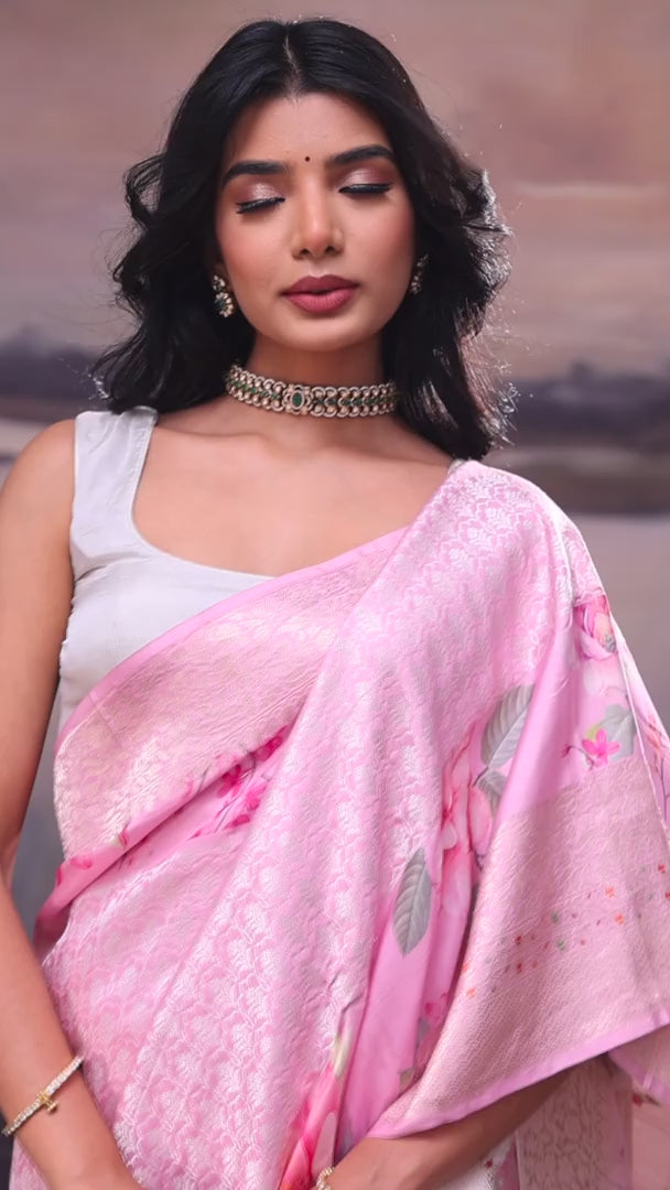 This Corfu Pink Silk Saree brings together digital floral printing with traditional banarasi borders. The contrast between modern prints and classic Banarasi work creates a unique statement. Comes with a matching blouse piece. Perfect for weddings and festive celebrations.