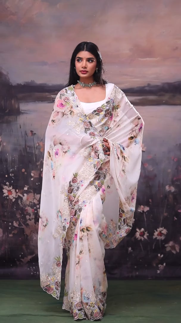 This Creamish White Georgette Saree features delicate floral printing throughout. The lightweight fabric with detailed floral needlework border creates a perfect balance of comfort and elegance. Comes with a matching blouse piece. Ideal for summer weddings and daytime events.