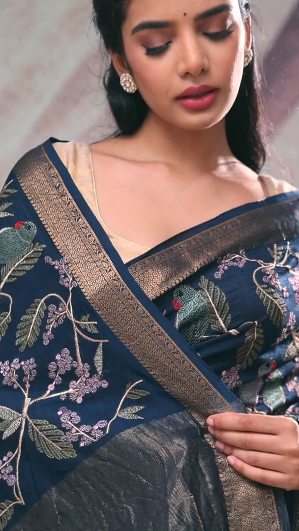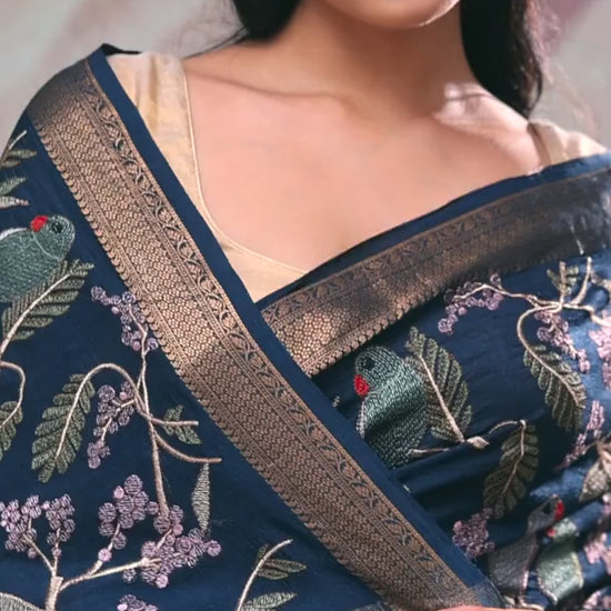 Dark Blue Resham Embroidery Moonga Silk Saree