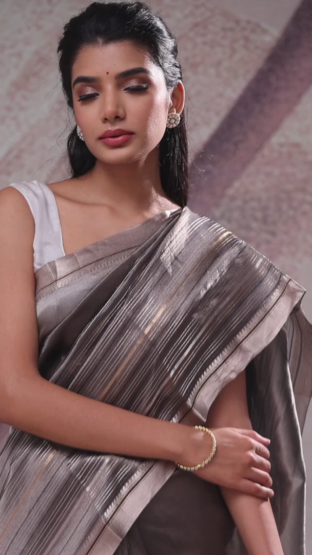 This Dark Grey Tissue Saree brings traditional and modern together with its classic weave and plain body border. The innovative edge gives this piece contemporary appeal. Comes with a matching blouse piece. Perfect for modern celebrations and fusion events.