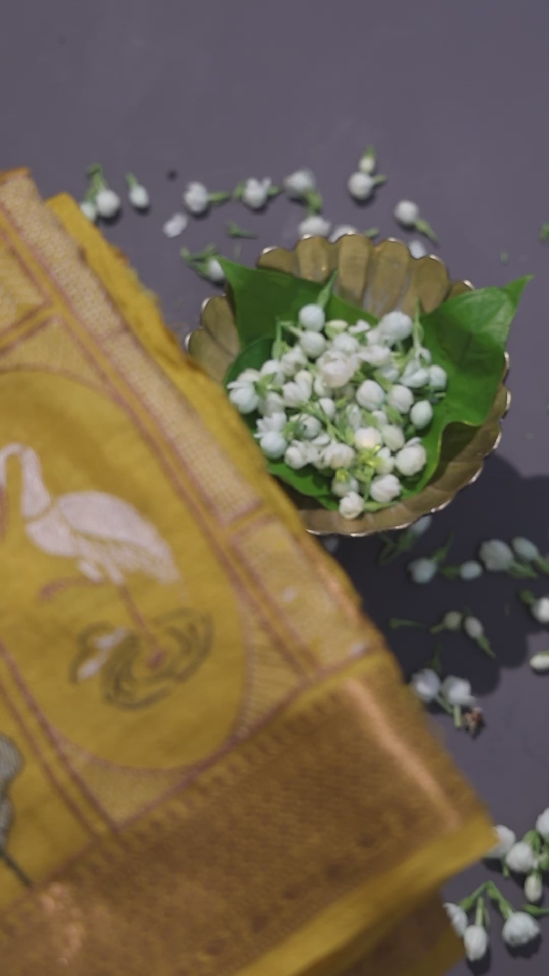 A super-stylish Dark Yellow Silk Saree with multicolor floral, lotus and stork embroidery all over. The border has traditional weave details. Comes with a matching blouse piece. Best for festive and wedding looks.