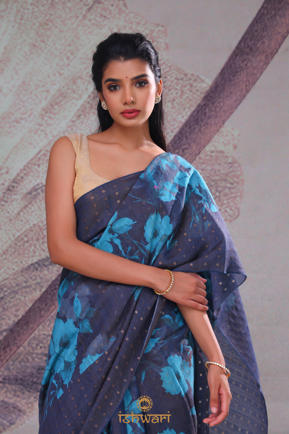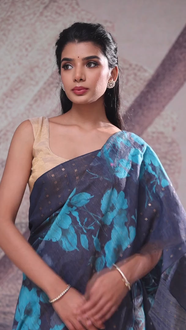 This Deep Blue Handloom Bailu Saree brings subtle elegance with floral patterns throughout. The sequined border catches the light with every move, adding just the right amount of sparkle. Comes with a matching blouse piece. Great for evening functions and celebrations.