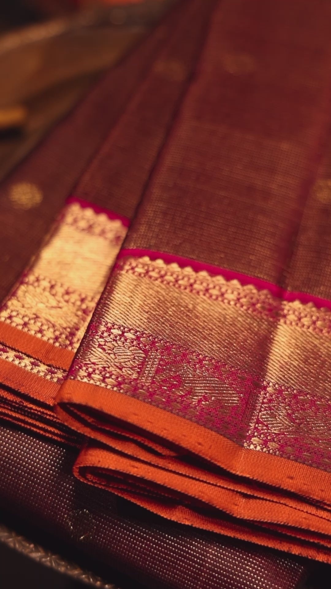 A classic Deep Brown Kanchi Silk Saree with bold Vaira Oosi Checks and butti weaves The border and pallu are rich in traditional patterns. Comes with a matching blouse piece. Ideal for temple visits and family functions.