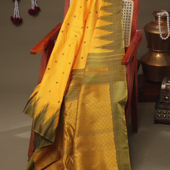 Gadwal Silk Saree in Mustard Yellow with Olive Green Temple Border