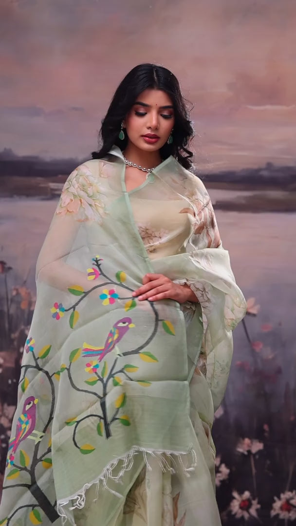 This Gin Green Handloom Kora Cotton Saree showcases detailed digital floral prints throughout. The pallu has colourful jamdani patterns as its highlight for a feminine look. Comes with a matching blouse piece. Ideal for daytime functions and family gatherings.
