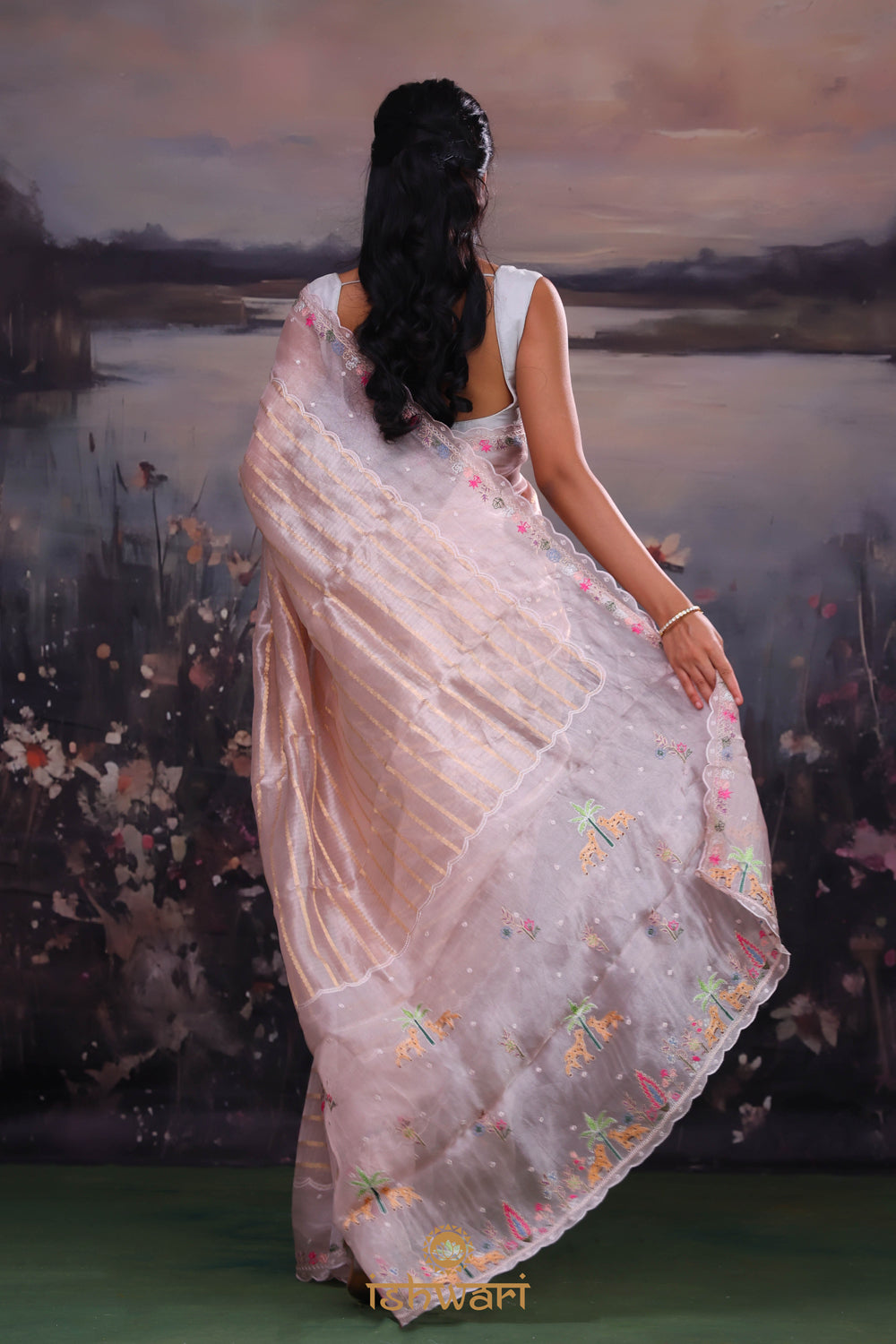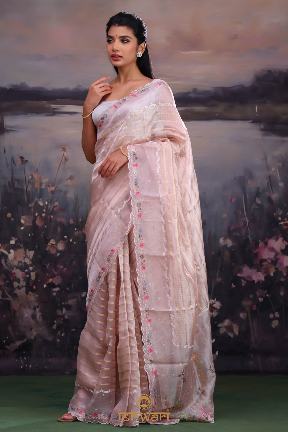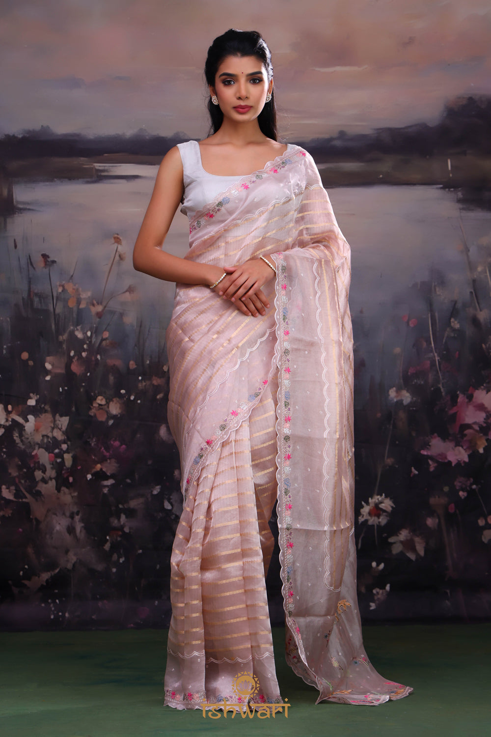 Gold Pink Striped Tissue Saree with Embroidered Border