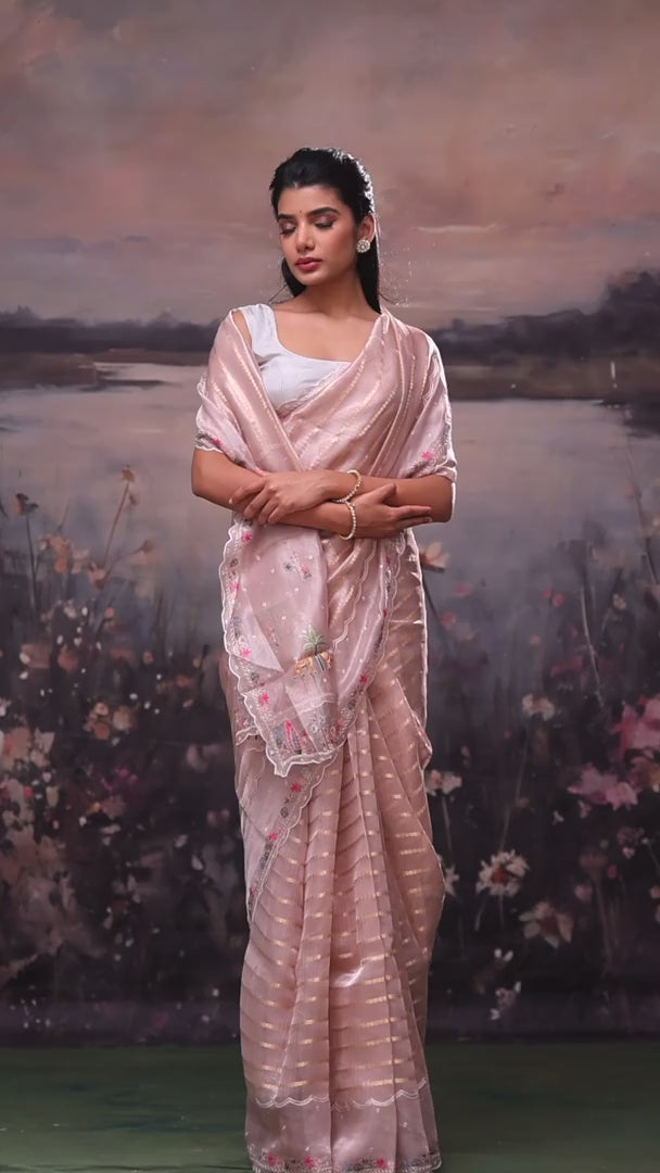 This Gold Pink Tissue Saree keeps it structured with linear stripe patterns and a detailed embroidered border. The contrast between simple body and ornate edge creates visual balance. Includes a coordinating blouse piece. Ideal for formal events and celebrations.