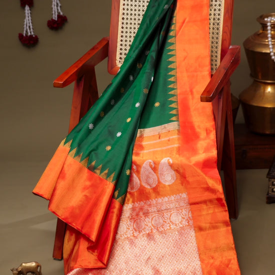This Gadwal silk saree is elegance woven in every detail. The deep green body is adorned with zari buttas, contrasted by a radiant orange tissue border that glows with festive charm. The pallu is richly woven with zari, adding a touch of grandeur that makes this saree a perfect choice for weddings, festivals, and traditional celebrations.