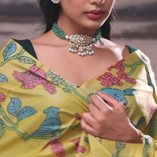 This Greenish Yellow Handloom Kalamkari Saree lights up any room with its bright base and traditional hand-painted artistry. The fabric quality adds dimension to this unique piece. Comes with a matching blouse piece. Perfect for festive occasions and cultural events.