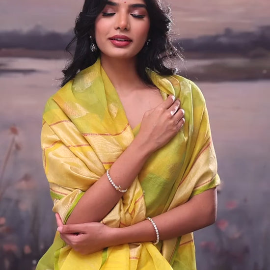 This Greenish Yellow Handloom Tissue Cotton Saree showcases delicate leaf patterns throughout. The soft yellow tone catches light beautifully, enhancing the natural sheen of Chanderi. Comes with a matching blouse piece. Perfect for festive occasions and daytime events.