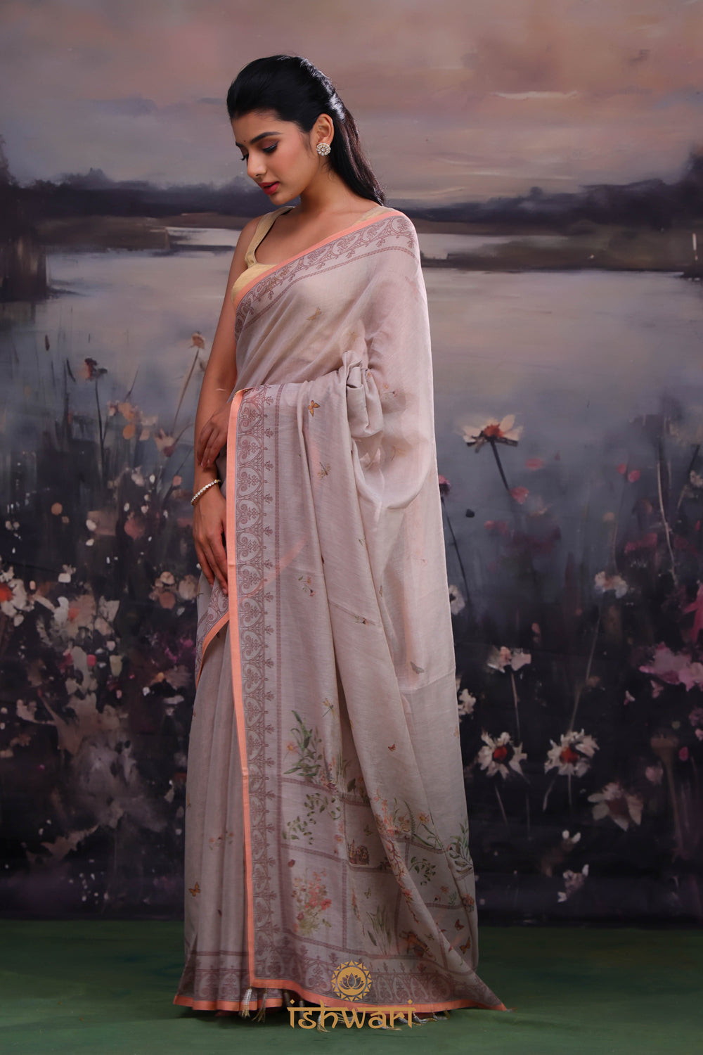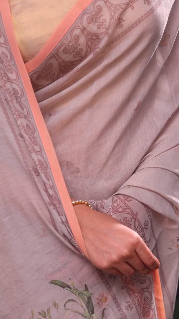 This Greyish Brown Mul Cotton Saree keeps it light and airy with its breathable weave. The subtle sheen and printed patterns adds a touch of elegance to this comfortable piece. No blouse piece included. Perfect for creating custom styling options for casual events.