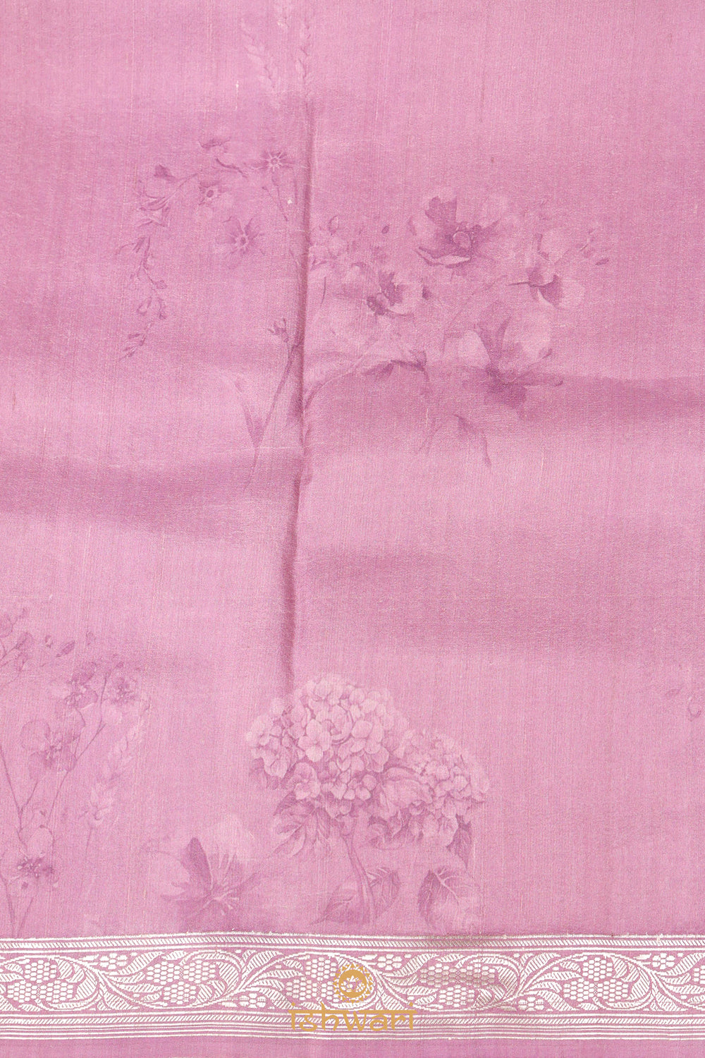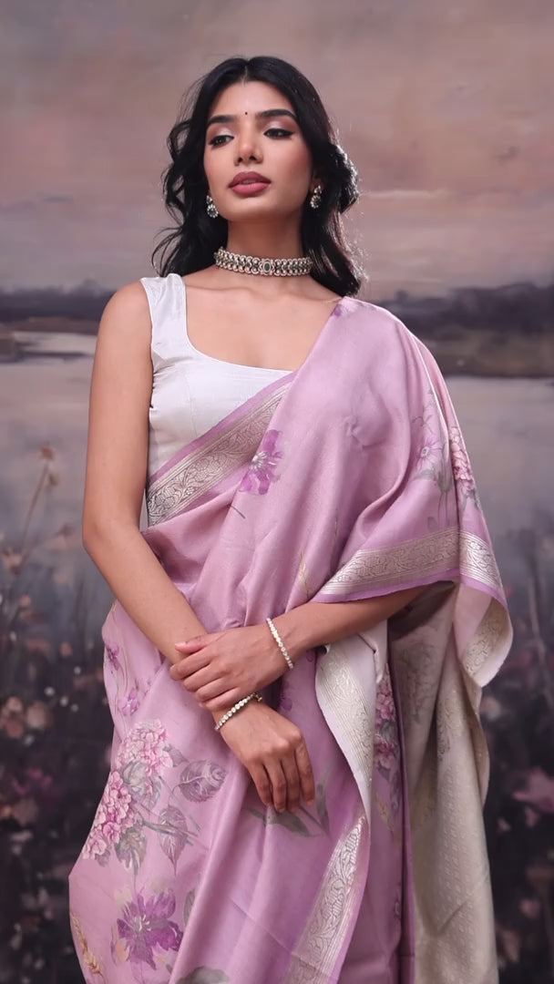 This Thistle Purple Handloom Tussar Saree features sophisticated digital floral patterns. The neutral tone makes it versatile, while the detailed zari work adds interest. Comes with a matching blouse piece. Perfect for work functions and casual gatherings.