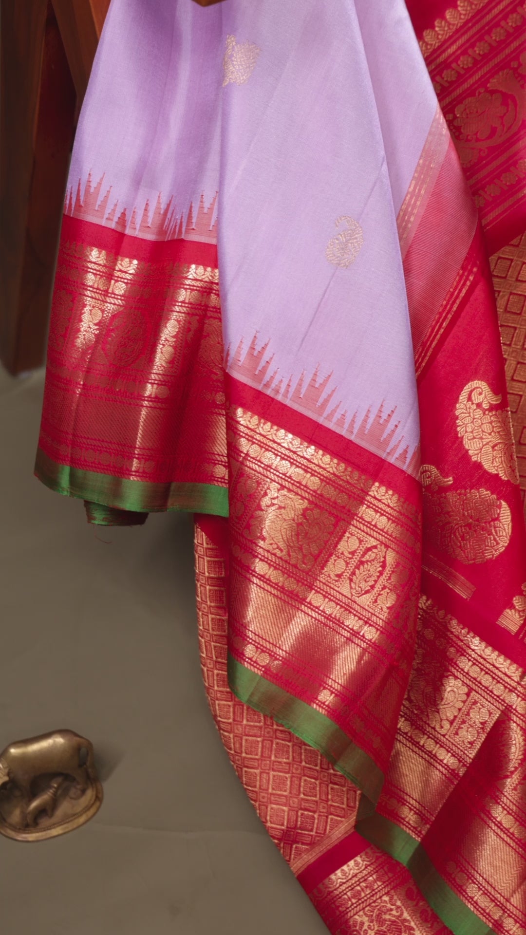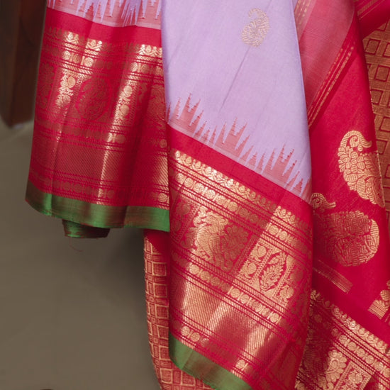 Lavender Gadwal Silk Saree with Red Zari Border and Green Selvedge