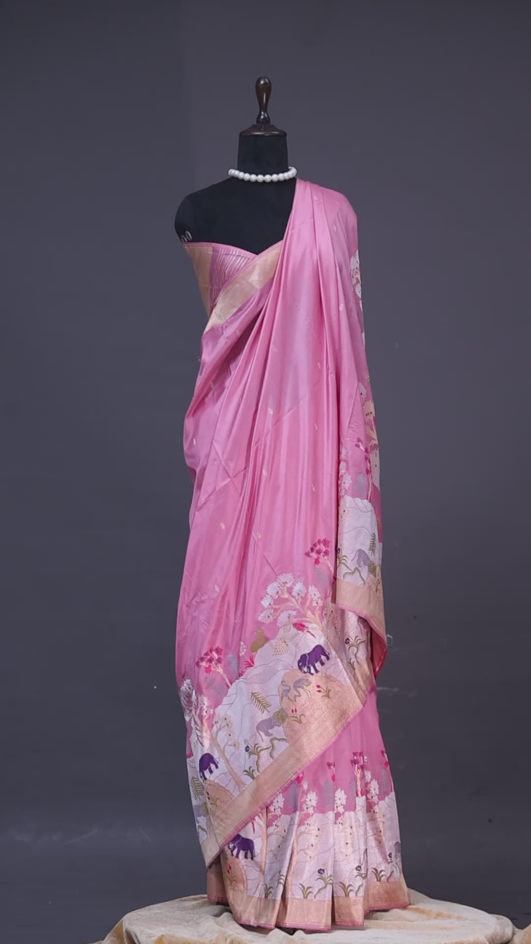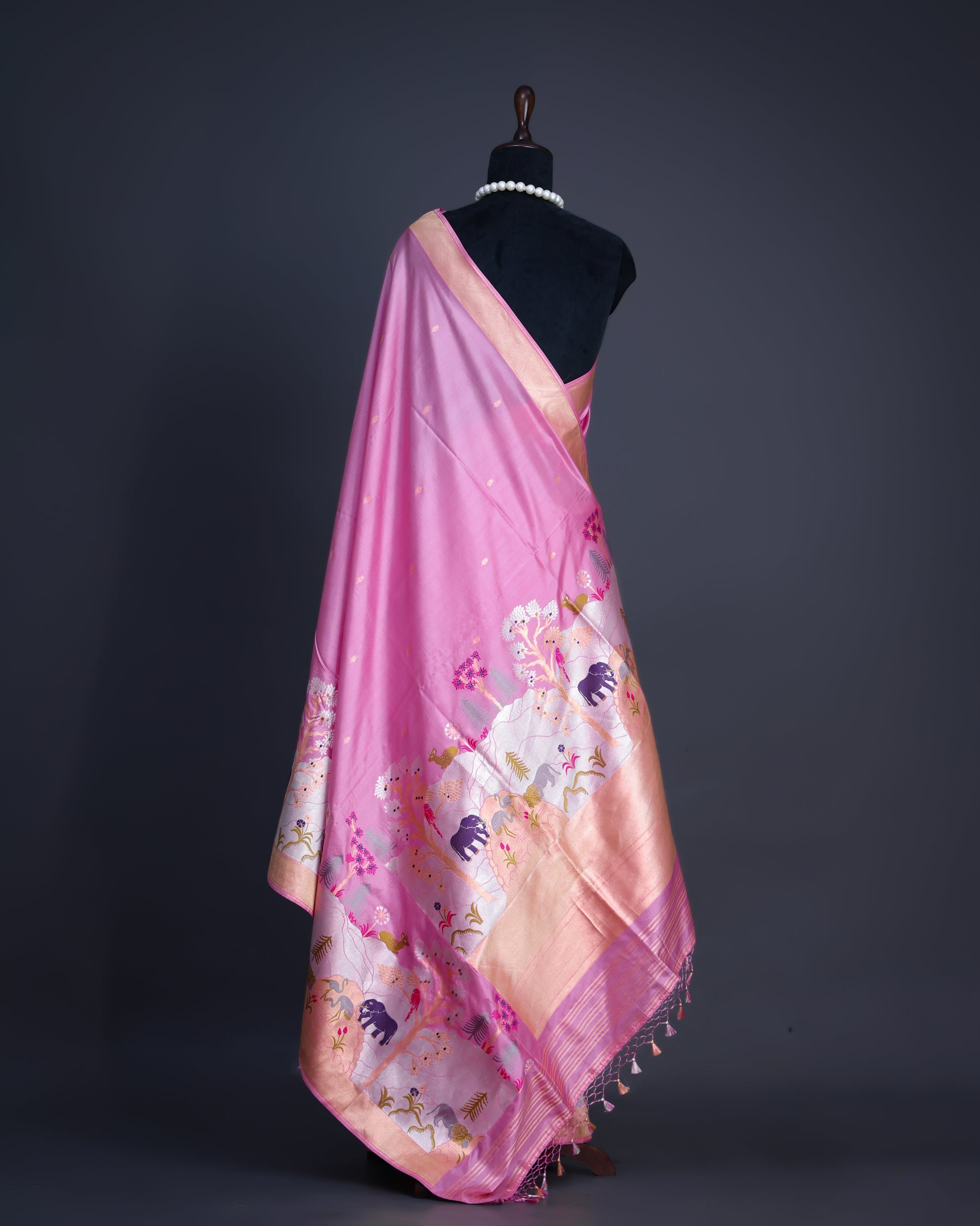 A dreamy Lavender Pink Banarasi Saree with beautiful Shikargah motifs on the border. The pallu has delicate woven details. Includes a matching blouse piece. Perfect for festive and grand celebrations.