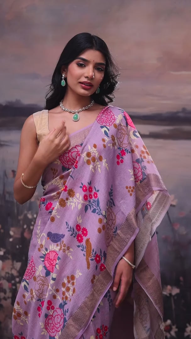 This Mauve Handloom Moonga Sareee features floral patterns with a zari woven border that catches light beautifully. The delicate floral bird work against the soft purple creates an elegant statement. Comes with a matching blouse piece. Perfect for evening events and celebrations.