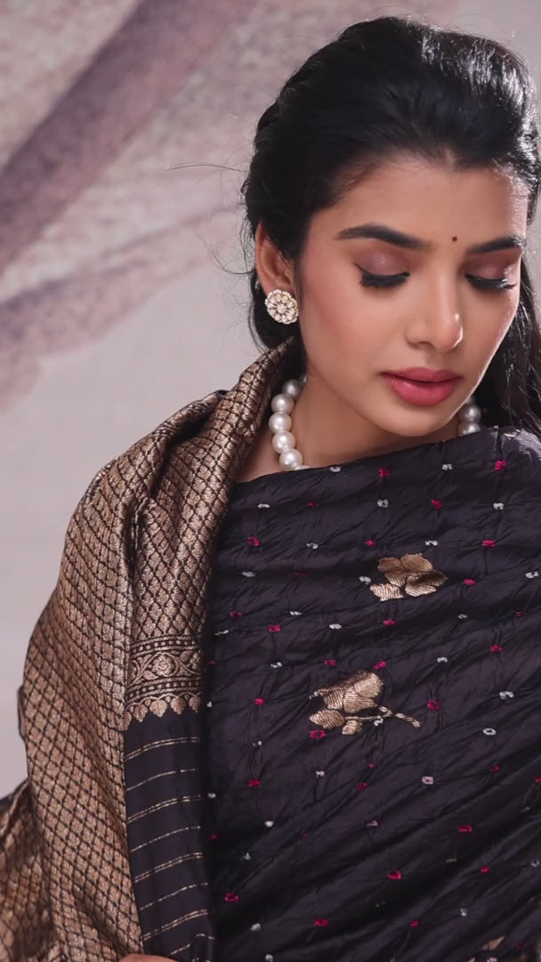 This Midnight Black Bandhej Saree creates dramatic contrast with its dark base and shimmering gold pallu. The traditional tie-dye patterns add textural interest throughout. Includes a coordinating ikkat blouse piece. Ideal for evening functions and festive occasions.