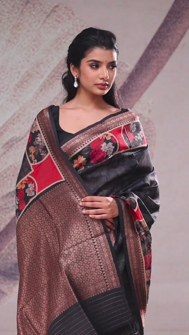 This Midnight Black Tussar Saree combines a classic floral printed base with botanical edge detailing. The contrast colour creates sophisticated appeal for special events. Includes a coordinating blouse piece. Ideal for evening gatherings and formal occasions.