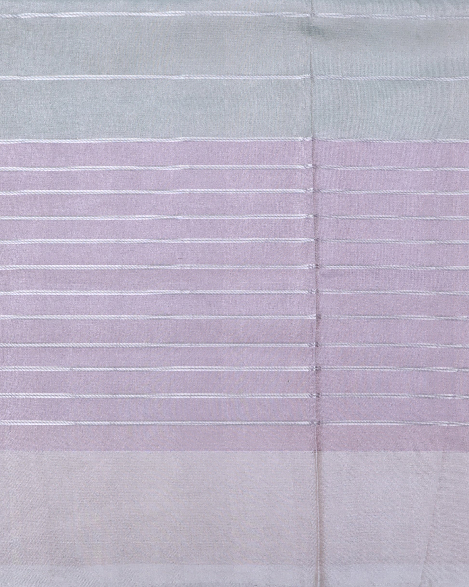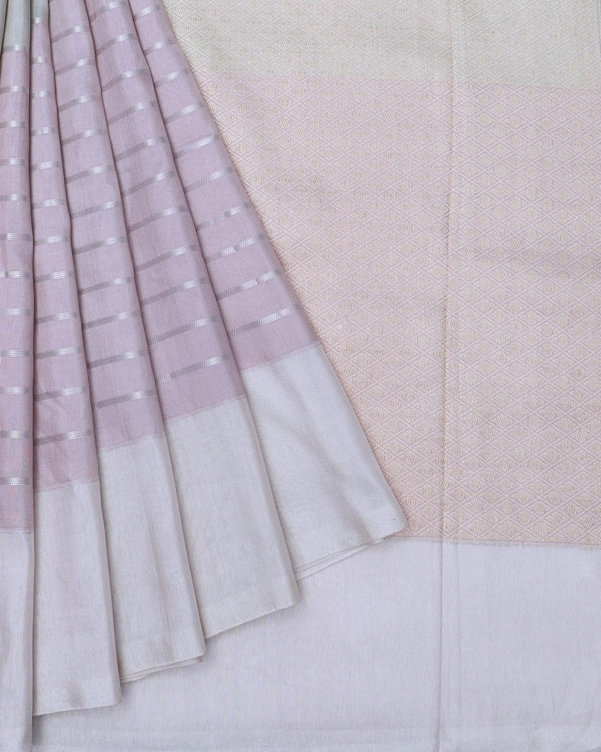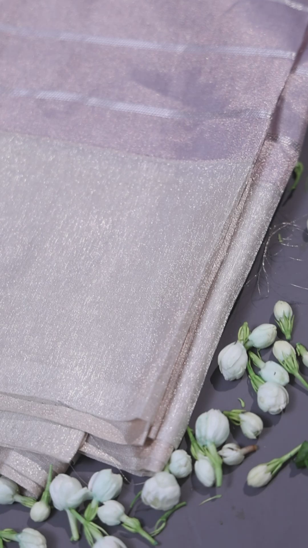 A trendy Banarasi saree with a pink & multi-shade tissue texture. The body has stylish silver stripes all over. The border and pallu come with rich woven details. Includes a matching blouse piece. Perfect for weddings and festive occasions.