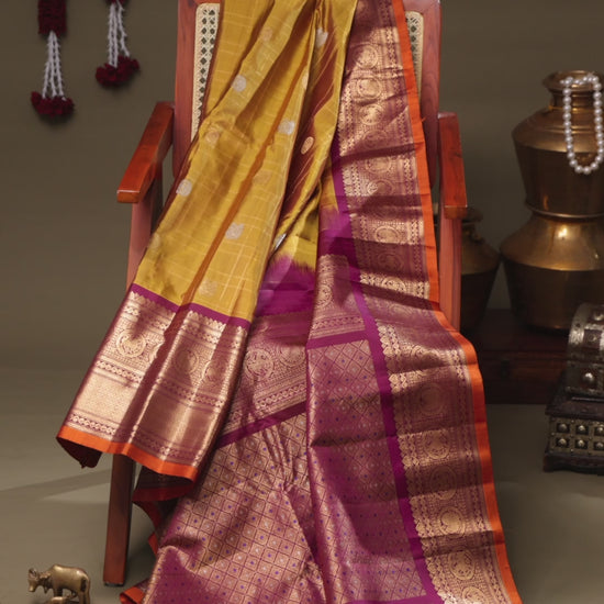 Mustard Yellow Gadwal Silk Saree with Purple Kanchi Border and Traditional Motifs