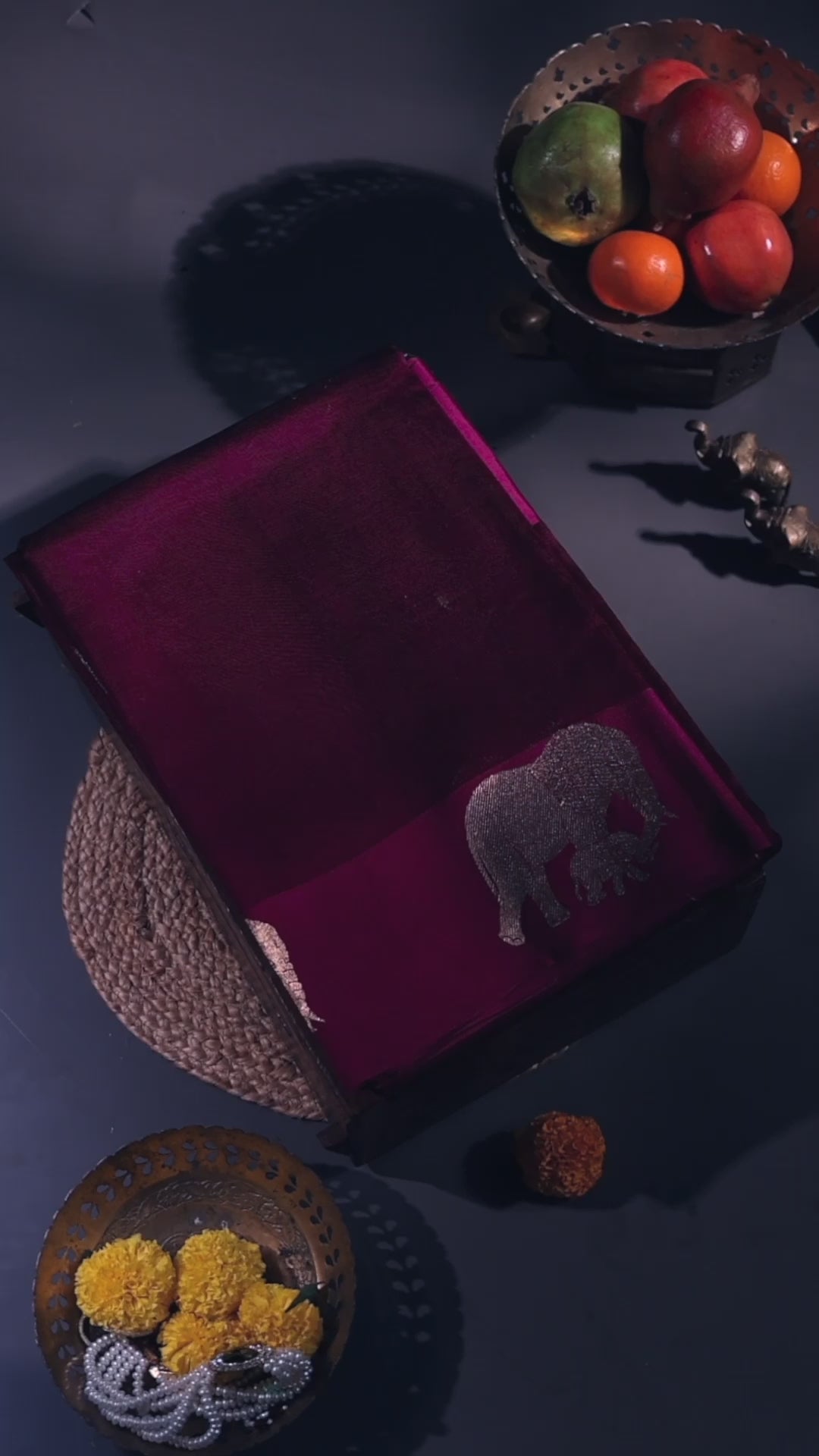 A rich Palatinate Purple Banarasi Goergette Satin Saree with a stunning border featuring detailed Elephant motifs. The pallu is full of intricate patterns. Paired with a matching blouse piece. Perfect for grand celebrations.