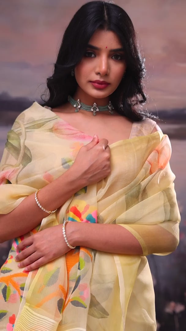 This Pale Yellow Handloom Kora Cotton Saree showcases detailed digital floral prints throughout. The pallu has colourful jamdani patterns as its highlight for a feminine look. Comes with a matching blouse piece. Ideal for daytime functions and family gatherings.
