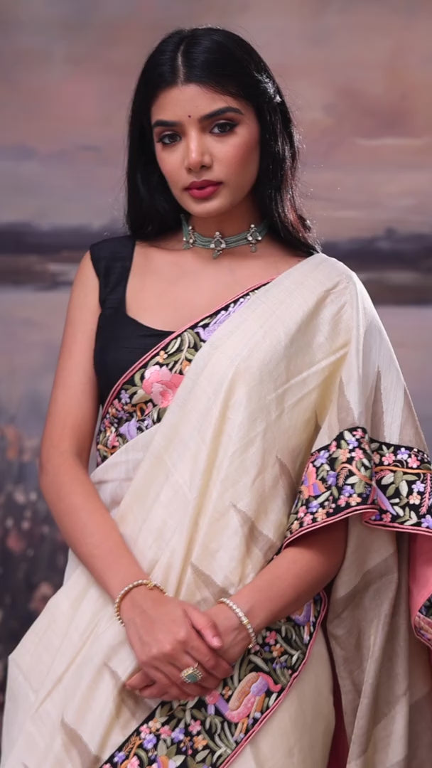 This Pastel Gold Tussar Saree makes a statement with its rich sheen and intricate black Petite Point border. The contrast detailing adds character to this traditional piece. Comes with a matching blouse piece. Perfect for weddings and festive celebrations.