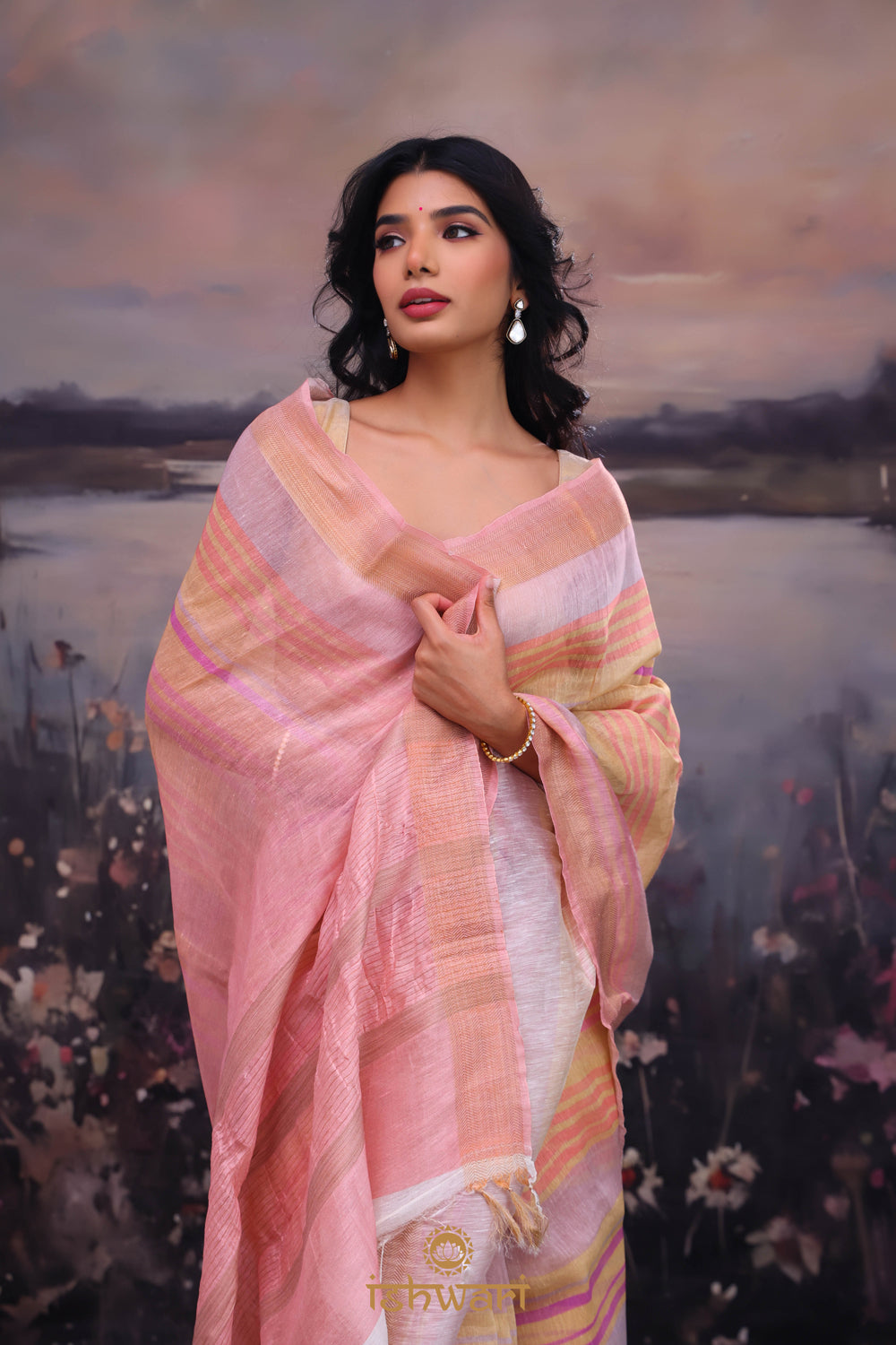 This Pastel Pink Handloom Linen Saree keeps it clean with sophisticated multicolour stripe pattern throughout. The natural texture of linen adds depth to the simple yet striking design. Comes with a matching blouse piece. Perfect for work events and casual gatherings.