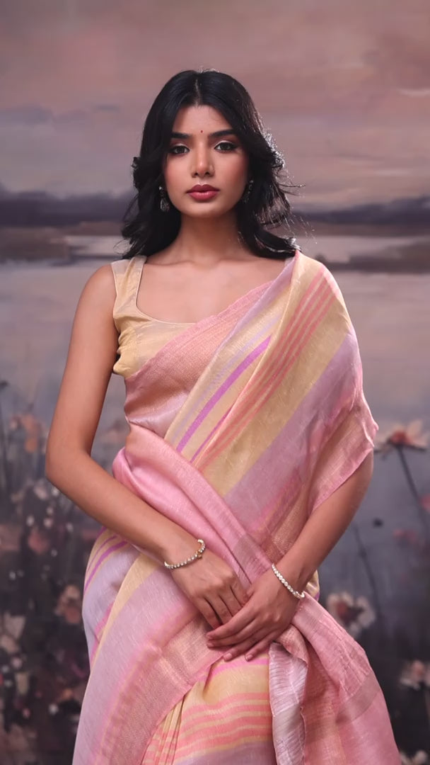 Pastel Pink Stripe Handloom Linen Saree