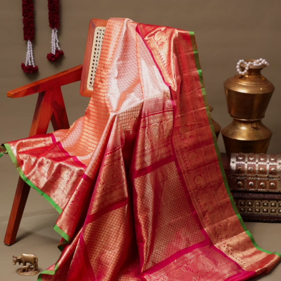 Peach Brocade Gadwal Silk Saree with Vermilion Zari Border and Green Selvedge
