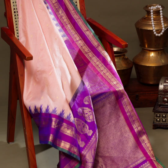 Step into elegance with this Peach Gadwal Silk Saree, beautifully paired with a regal purple zari border. The body features subtle checks with gold zari butas, while the border showcases classic zari detailing. The grand purple pallu is adorned with rich paisley motifs, adding timeless grandeur.