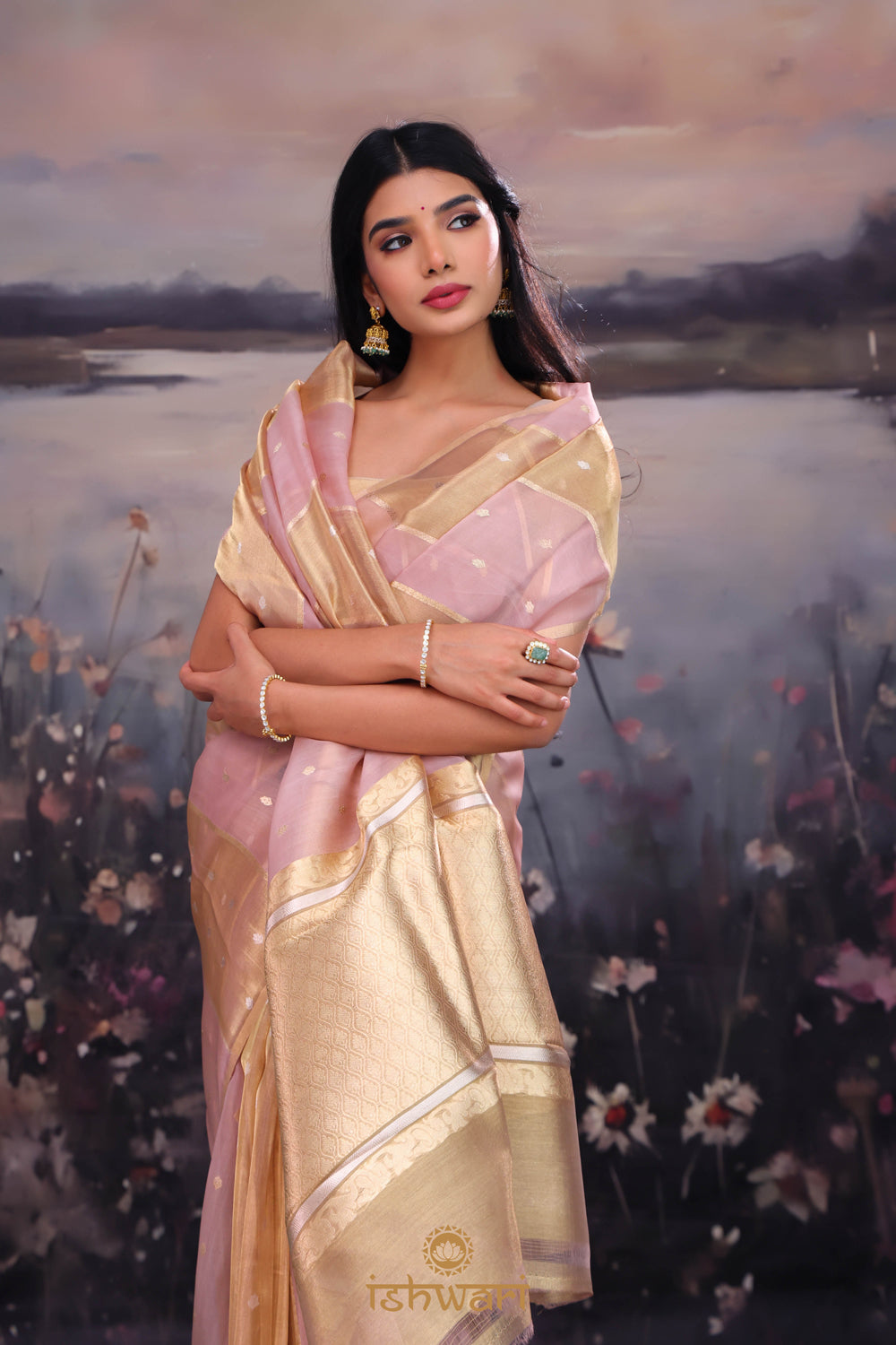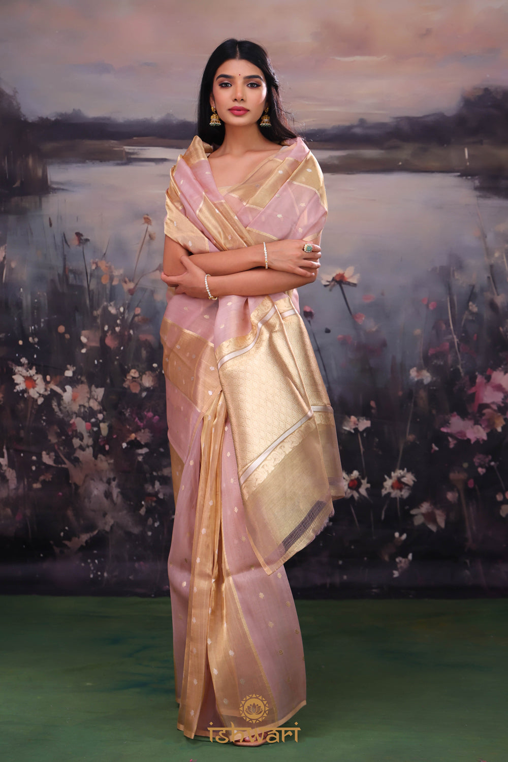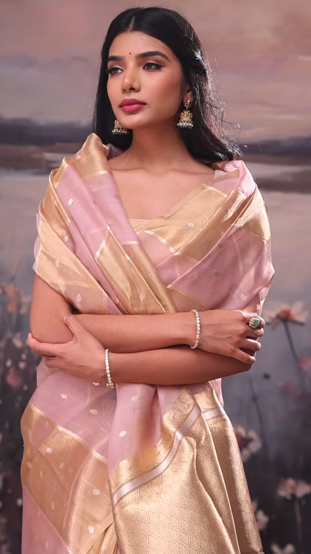 This Pink Gold Vertical Striped Organza Tissue Saree keeps it contemporary with linear patterns throughout. The subtle shimmer of the tissue fabric adds a festive touch. Comes with a matching blouse piece. Ideal for evening functions and celebrations.